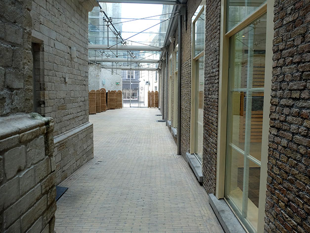 Overdekt straatje tussen de kerk en een ander gebouw in (maar het is geen doorgang)