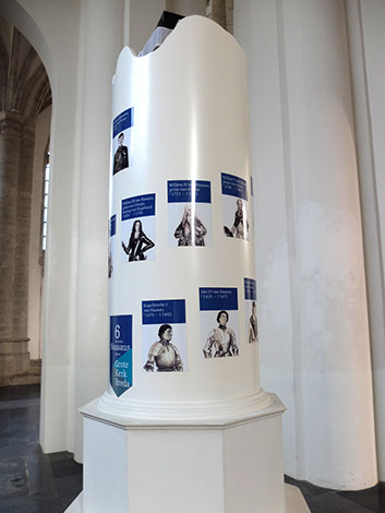 Deze 'pilaar' laat zien welke Nassau's met de kerk verbonden waren, in chronologische volgorde. Door de manier van presenteren is het net alsof ze allemaal een deel van de kerk hebben gebouwd, steeds hoger.
