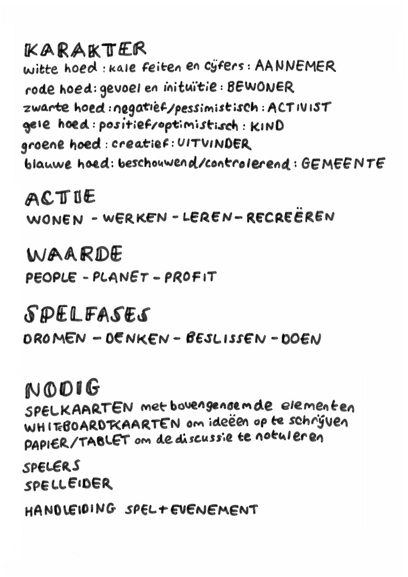 In ons spel maken we gebruik van karakters omdat we ambtenaren niet alleen willen uitnodigen om op een andere manier te denken, ook om de denkwijzen, waarden en belangen te kunnen koppelen aan personen. Sommige karakters zijn ook duidelijk mensen die betrokken zouden kunnen zijn bij het Corbiongebied; sowieso de gemeente en de aannemer (de eigenaar van het gebied is Corbion). Het is een verschil of je vanuit de feiten of vanuit een aannemer moet kijken naar een bepaald probleem. Ik denk zelf dat het handig is om karakters te gebruiken die aan de denkhoeden van Bono zijn gekoppeld. Die geven best een volledig beeld van de manieren waarop je een situatie kunt benaderen.