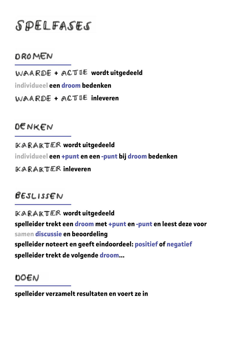 ● In de beslisfase heeft iedereen een karakter, bij elke ingebrachte droom door de spelers denk je als speler steeds bijvoorbeeld vanuit de rol van de aannemer. Het is afwisselender als de karakters bij elke droom weer opnieuw worden uitgedeeld.