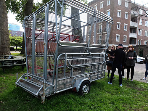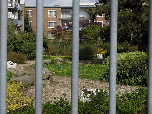 We krijgen een rondleiding door de buurt door Roel Schoenmakers van Cascoland. Hij vertelt dat ze vooral actief zijn in deze wijk. Cascoland doet ook projecten in het buitenland. We lopen langs verschillende initiatieven. De wijk is ruim opgezet met veel groen. Tussen twee flats is een soort park aangelegd. Het wordt afsloten met een hek. De poort is dicht; dit gedeelte is niet toegankelijk voor de bewoners, terwijl ze wel moeten meebetalen voor het onderhoud. Aan de andere kant van het plein waar we nu staan is er een zelfde situatie,