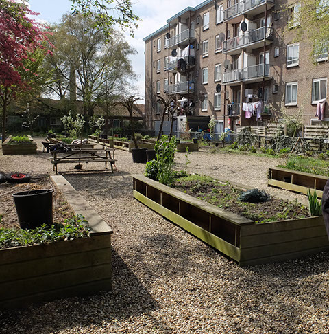 behalve dat de tuin wel toegankelijk is. Daar is het geen park, maar een moestuin. In bakken worden verschillende groenten verbouwd. De bewoners kweken zelf hun groenten, en door middel van deze moestuin komen ze ook met elkaar in contact. Cascoland heeft ook ooit een mobiele moestuin bedacht: een aanhanger waar potten in konden staan, en ik geloof dat er nog meer verschillende functies waren. Er waren ook tafels en banken die ernaast konden worden gezet.