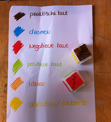 ● Paula had twee dobbelstenen bedacht: een positief/negatief-dobbelsteen en een thema-dobbelsteen. De thema-dobbelsteen was niet zo duidelijk en het wordt best ingewikkeld als er naast een karakter, een waarde en een activiteit ook nog een thema is. Positief/negatief zou wel goed werken, dan geeft meer richting aan de discussie.